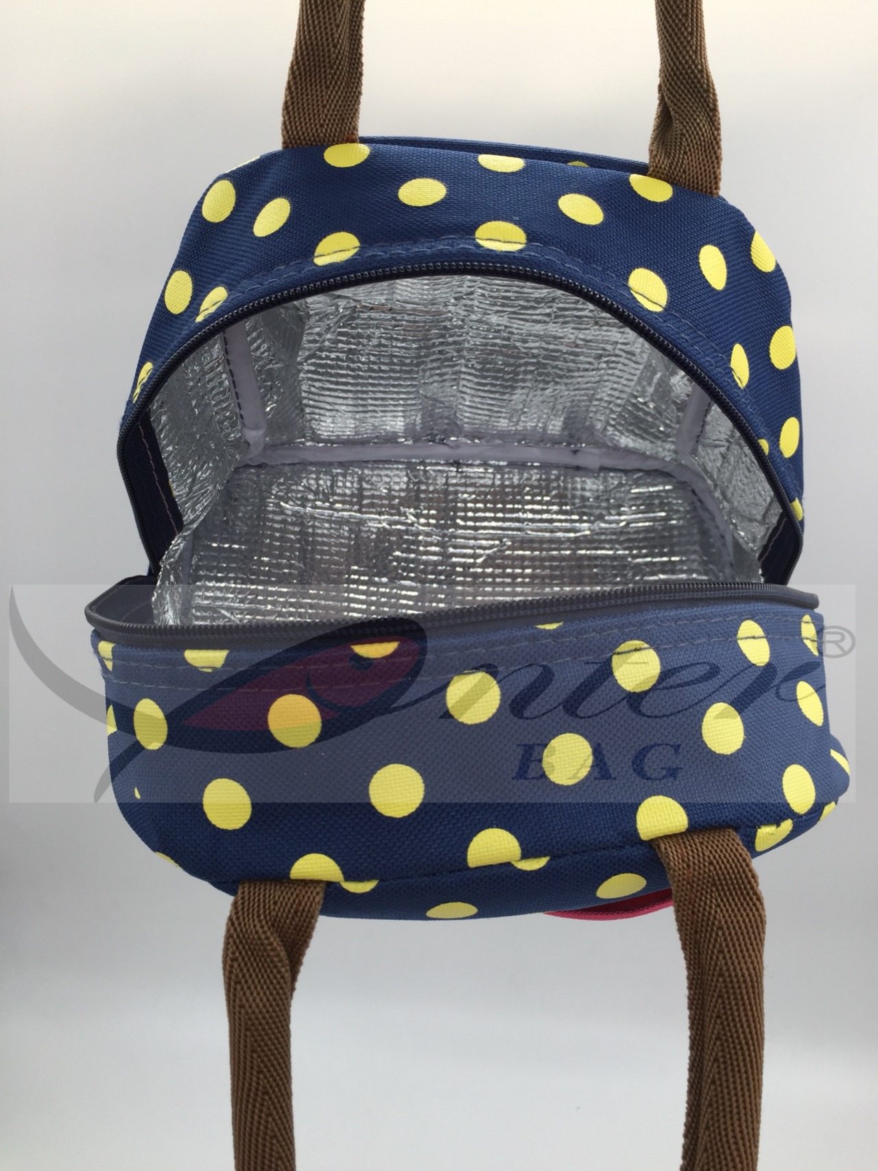 材质 :600d polyester 网印印刷 棉织带手提用途 : 外出保温保冷袋 餐袋 。学生/上班族使用的便当袋。内层铝膜好清洗尺寸材质皆可客制化